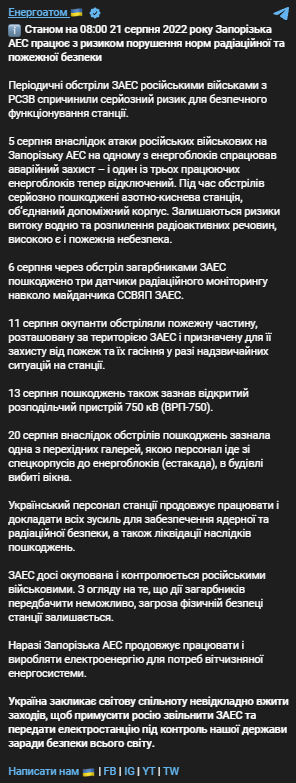 На утро 21 августа Запорожская АЭС работает с риском нарушения норм радиационной и пожарной безопасности, заключают в компании.