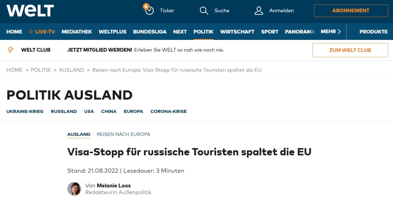 10:52 Ограничение виз для туристов из РФ "раскололо ЕС", пишет Die Welt.