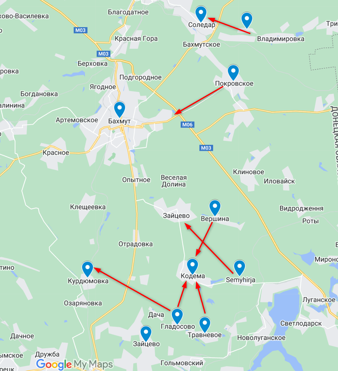 К югу от Бахмута продолжаются атаки противника на Кодему с трех сторон - от Вершины, Гладосово и Травневого. Там же стоит отметить наступление на Курдюмовку, которая находится западнее трассы Бахмут-Горловка (смог ли противник ее перерезать, пока неизвестно).