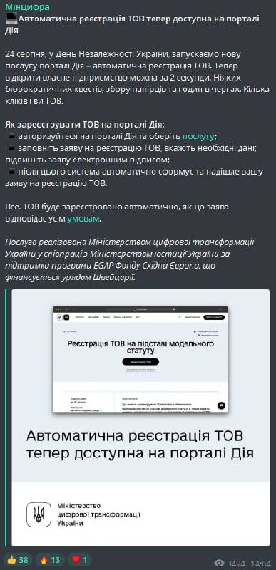 Теперь открыть Общество с ограниченной ответственность (ООО) можно в режиме онлайн, через портал "Дія". В Министерстве цифровой трансформации заявляют, что процедура осуществляется в считанные секунды.