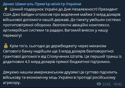 "Сегодня в госбюджет через механизм Всемирного банка поступило еще 3 млрд долларов безвозвратной грантовой помощи от Соединенных Штатов. Это первый транш из дополнительных 4,5 млрд долларов прямой бюджетной поддержки", - написал Шмыгаль.