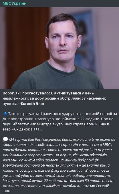 Также вчера под обстрелом оказались 58 населенных пунктов, заявил замминистра внутренних дел Украины Евгений Енин.