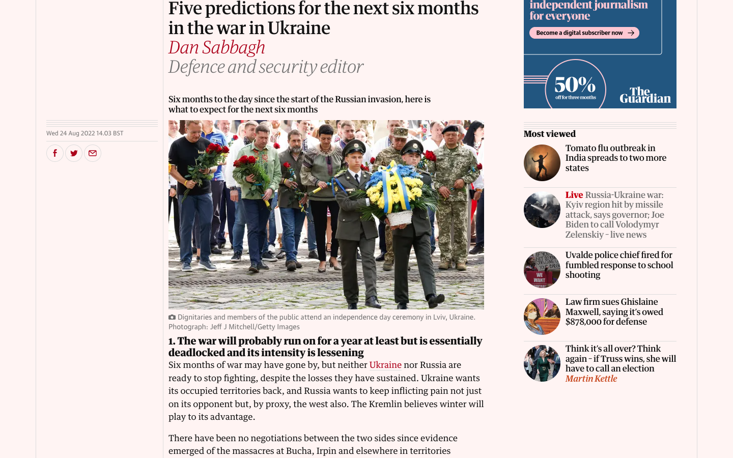 5. Запад должен решить, хочет ли он, чтобы Украина одержала победу или "просто удержалась". Газета отмечает, что западные политики только обещают масштабную военную помощь, но по факту не предоставляют необходимое количество тяжелой техники. Также накладывается потребность в гуманитарной помощи на фоне падения экономики Украины.