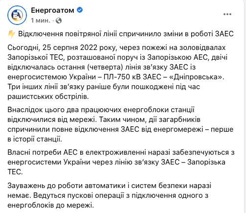 Впервые в истории произошло полное отключение Запорожской АЭС от энергосети, сообщает Энергоатом.