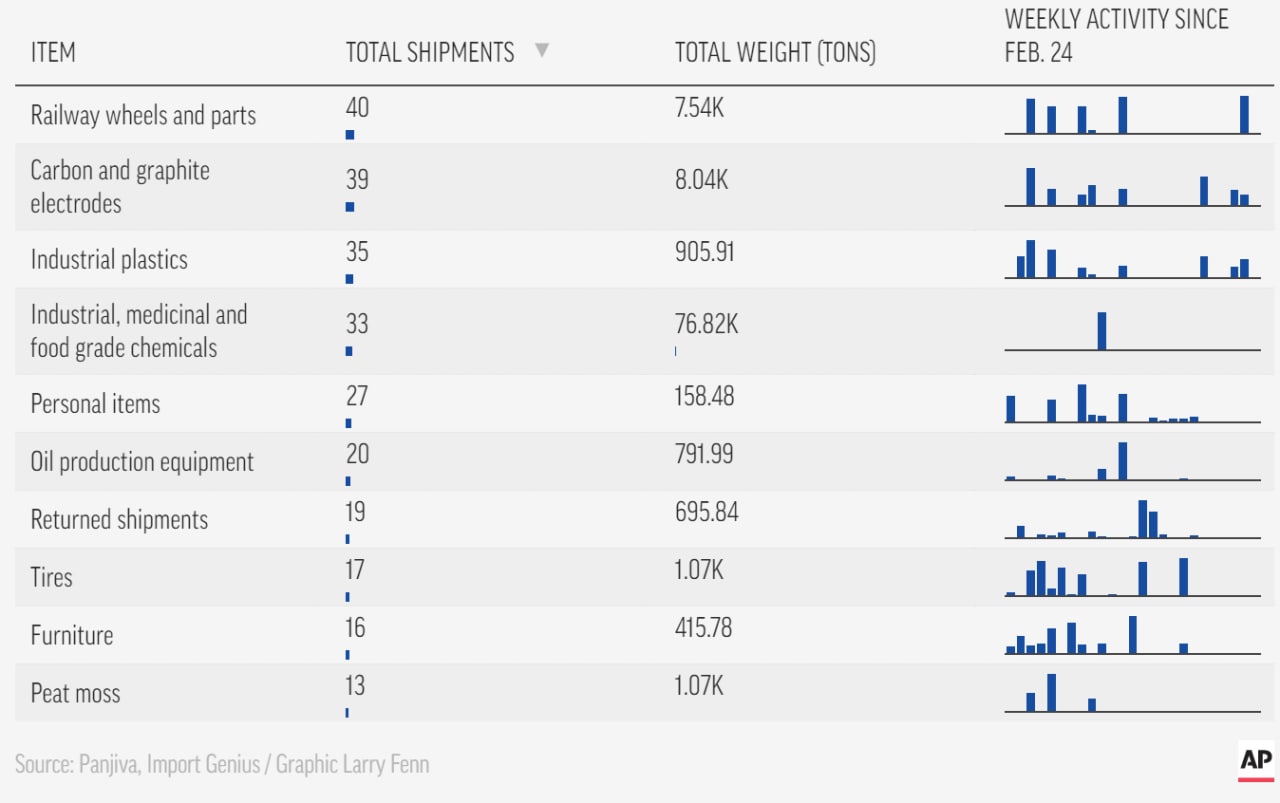 08:02 Агентство "Ассошиэйтед Пресс" обнаружило, что более 3600 партий древесины, металлов, резины и других товаров, прибывших в США из России с тех пор, как в феврале она начала вторжение в Украину.