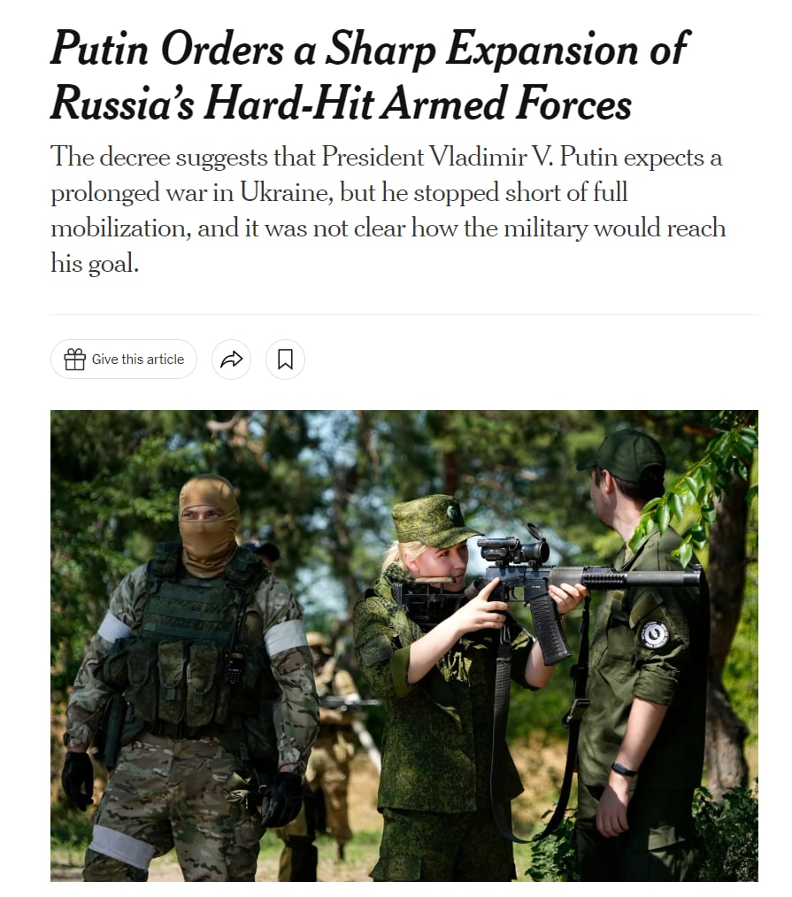 "Указ о расширении численности армии свидетельствует о том, что г-н Путин готов продолжать войну", - пишет газета, но уточняет, что непонятно, как Россия собирается сдвинуть фронт с мертвой точки.