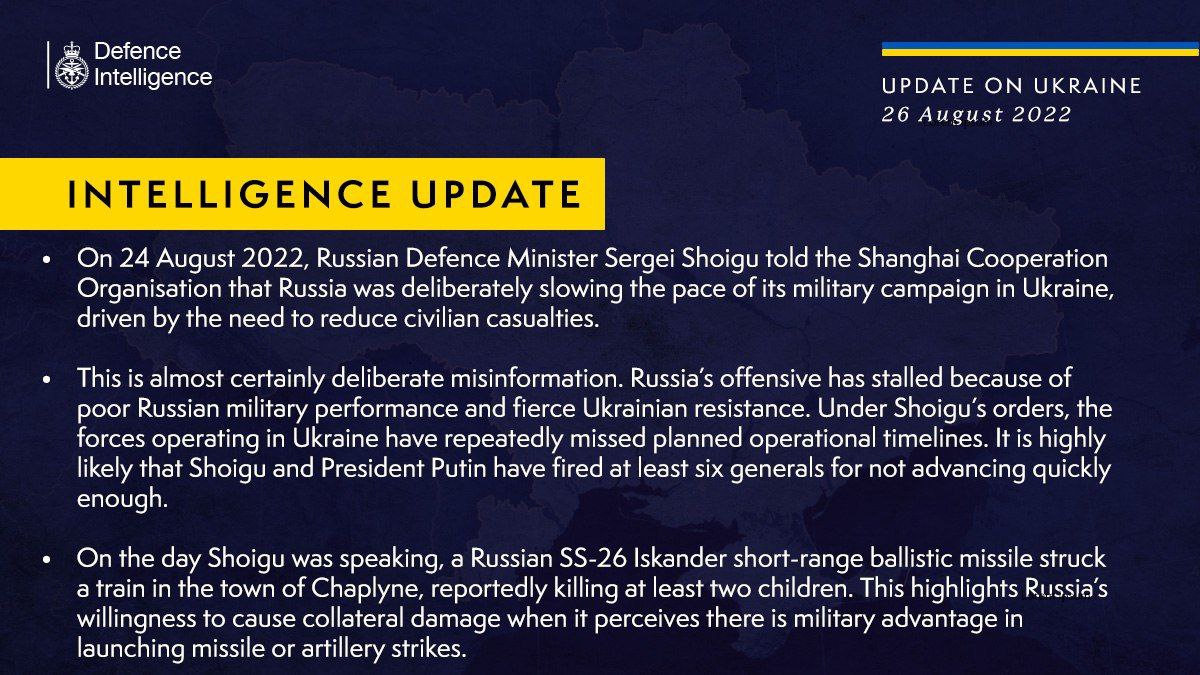 В день выступления Шойгу российская баллистическая ракета "Искандер" поразила поезд в городе Чаплино, в результате чего, как сообщается, погибли по меньшей мере двое детей. Это подчеркивает готовность РФ нанести побочный ущерб, когда она видит военное преимущество в нанесении ракетных или артиллерийских ударов, считает разведка Британии.