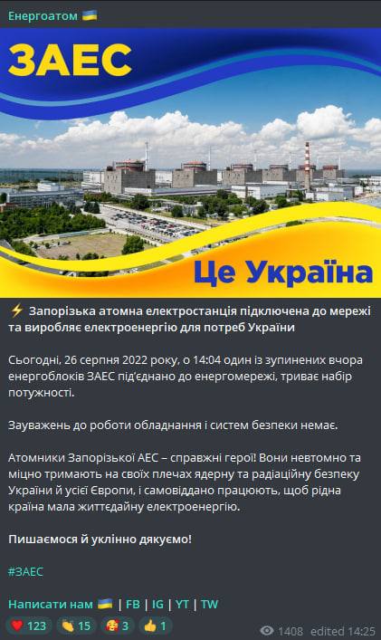 "Сегодня, 26 августа 2022 года, в 21:15 второй из остановленных вчера энергоблоков ЗАЭС подключен к сети, продолжается набор мощности. Замечаний к работе оборудования и систем безопасности нет", – говорится в сообщении.