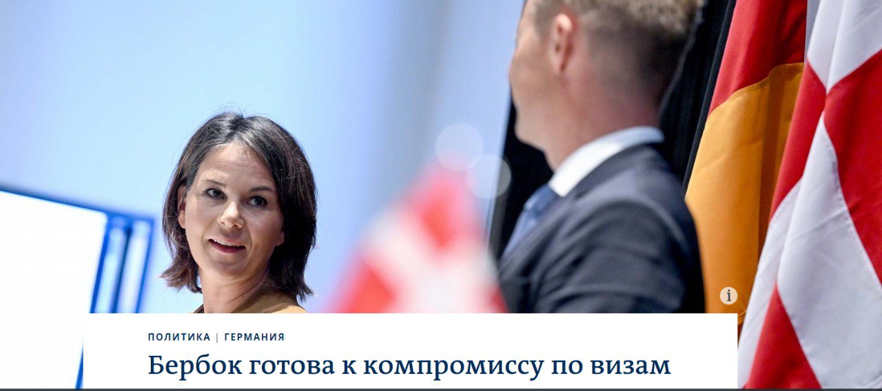 23:17 Глава МИД Германии Анналена Бербок выступает за компромисс в вопросе о предоставлении гражданам РФ шенгенских виз. Об этом она заявила в Копенгагене в ходе беседы с главой МИД Дании Йеппе Кофодом, сообщает Deutsche Welle.