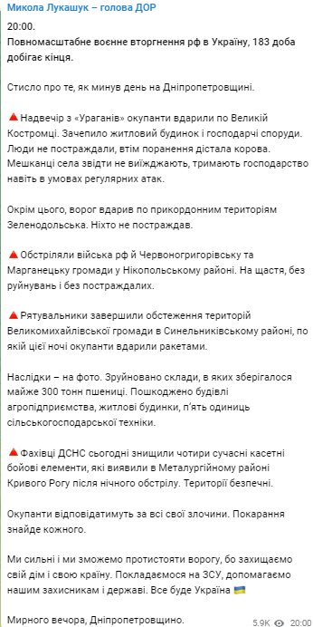 Кроме этого, в публикации Лукашука говорится об обстрелах Зеленодольска, а также Красногригорьевской и Марганецкой общины в Никопольском районе. Здесь без разрушений и без пострадавших.