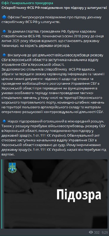 Подозреваемый россиянин и завербованный военнослужащий резерва СБУ объявлены в международный розыск. Третий фигурант - замначальника отдела управления СБУ в Херсонской области находится под стражей. Его обвиняют в госизмене.
