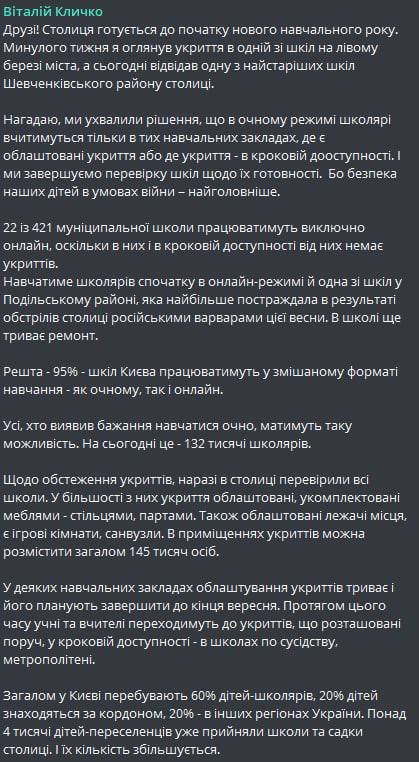Согласно подсчетам КГГА, 60% киевских школьников на данный момент остаются в столице. Только 20% детей уехали за границу, а еще 20% – в другие регионы Украины.