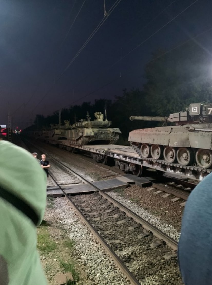 Кроме этого, есть танки Т-72 и Т-80, боевые машины пехоты, грузовые автомобили – в том числе на базе ракетных тягачей. В составе воинского эшелона - крытые вагоны и цистерны с топливом.