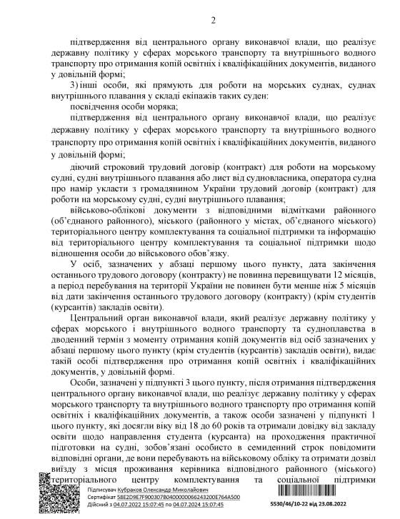 - Лица, направляющиеся для работы на суднах в составе экипажей, осуществляющих рейсы из/в морские порты Украины, предъявляют: удостоверения личности моряка, судовую роль, подтверждение от уполномоченного в сфере морского транспорта центрального органа исполнительной власти о получении копий образовательных и квалификационных документов выезжающего.