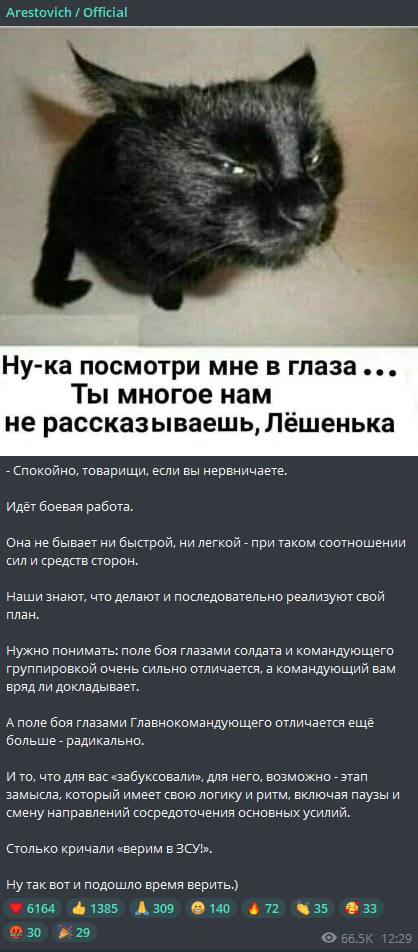 "Идёт боевая работа. Она не бывает ни быстрой, ни легкой - при таком соотношении сил и средств сторон. Наши знают, что делают и последовательно реализуют свой план… И то, что для вас "забуксовали", для него (главнокомандующего - Ред.), возможно - этап замысла, который имеет свою логику и ритм, включая паузы и смену направлений сосредоточения основных усилий", - написал Арестович.