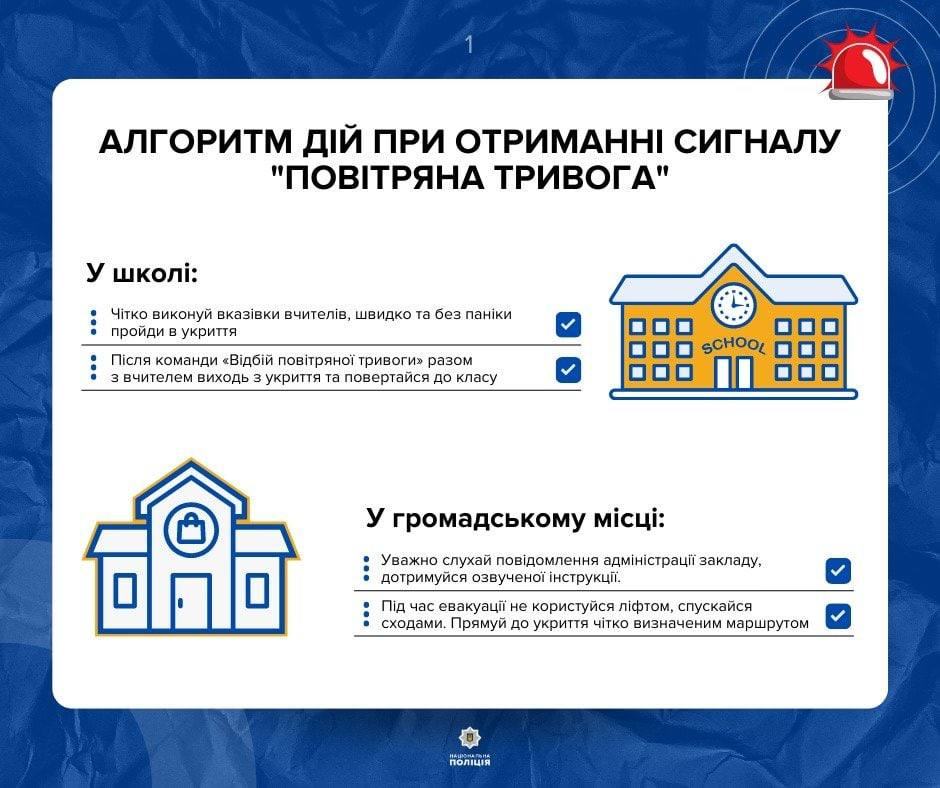 Также полиция опубликовала рекомендации родителям и детям на случай сигнала воздушной тревоги.