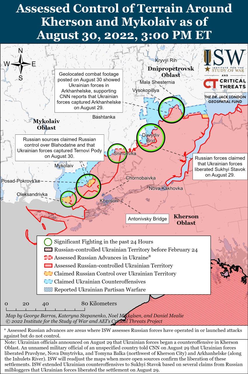 3. Российские военные телеграм-каналы (в частности, Стрелков-Гиркин, который часто критикует военное руководство РФ) пишут о том, что в районе Демидова Брода ВСУ продвинуться со вчерашнего дня не смогли и были отброшены от Сухого Ставка и Благодатовки. При этом ВСУ удерживают Андреевку и Лозовое на левом берегу Ингульца.