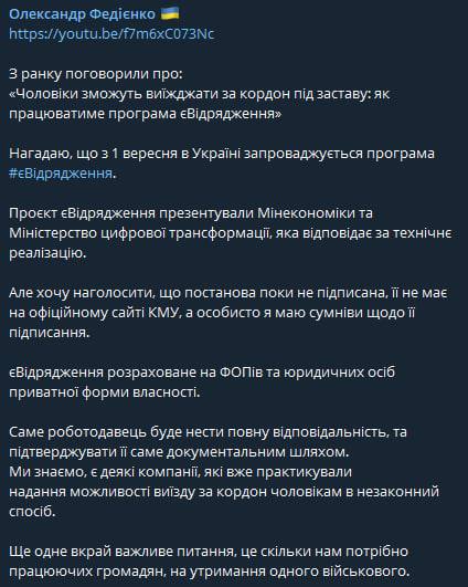"Постановление пока не подписано, его нет на официальном сайте КМУ, а лично я сомневаюсь в его подписании", - написал Федиенко в Telegram.