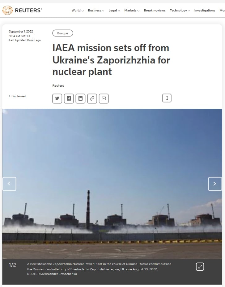 Около 12:24 миссия МАГАТЭ вела переговоры с военными Украины для того, чтобы попасть на ЗАЭС. По данным Reuters, миссия задержалась на три часа на подконтрольной Украине территории, но, как сообщил представитель организации, намерена достичь ЗАЭС.