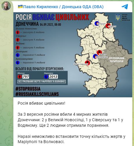 08.15 В Донецкой области от обстрелов за прошлые сутки погибли 4 мирных жителя: 2 в Великой Новоселке, 1 в Северске и 1 в Водяном. Еще 2 человека получили ранения.