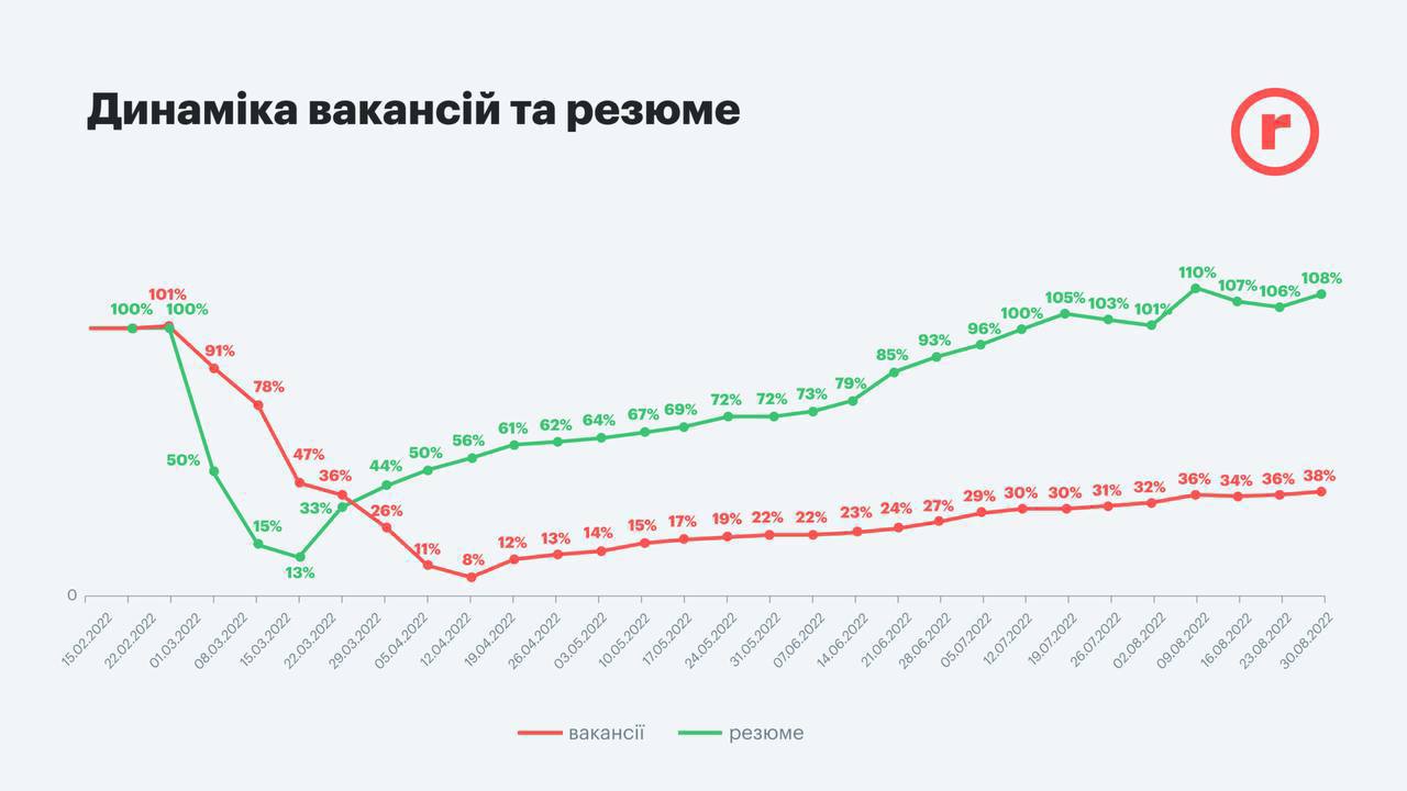 Лидером среди открытых вакансий является Киев, самая плохая ситуация — рядом с линией фронта. К примеру, в Николаеве есть только 300 вакансий, в то время как в Киеве — 13 000.