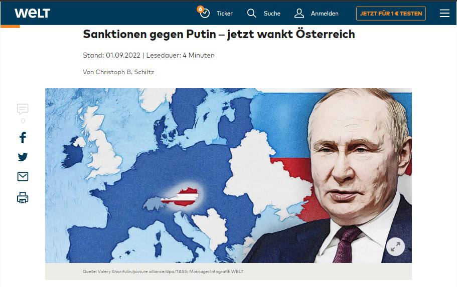 Ссылаясь на результаты недавно проведенных опросов, издание утверждает, что на сегодняшний день уже 40% граждан Австрии выступают за отмену ограничений, введенных против России. Причиной таких перемен в настроениях общества называются рост цен на энергию и высокая инфляция. "В Австрии больше нет четкого большинства, выступающего за санкции", - констатирует Die Welt.