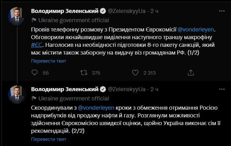 16.23 Президент Украины Владимир Зеленский заявил, что указал президенту Еврокомиссии Урсулой фон дер Ляйен на необходимость подготовки 8-го пакета санкций, а также обсудил с ней вопрос выделения Украине денег от ЕС.