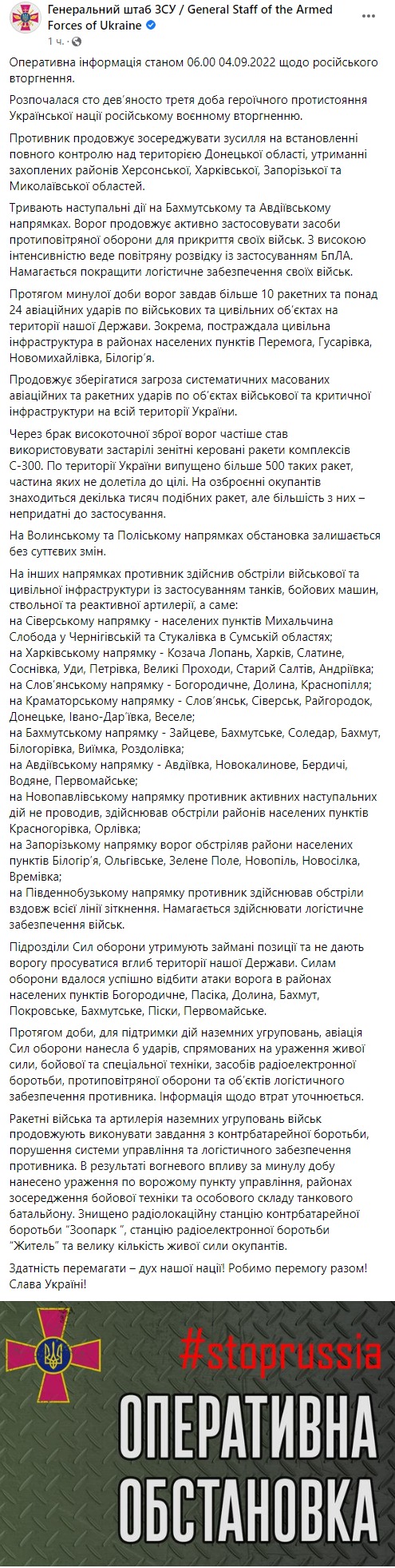 Утром 4 сентября в Генштабе Вооруженных Сил Украины опубликовали оперативную сводку.
