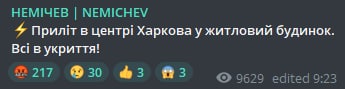 09.38 В центре Харькова прилет в жилой дом, сообщает глава штаба "Кракена" Константин Немичев.
