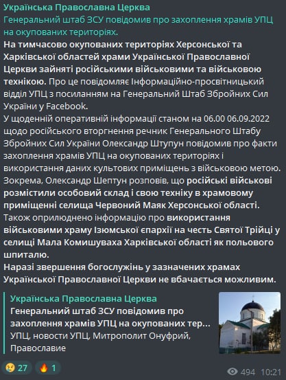 10.40 Украинская православная церковь пишет про захват храмов УПЦ на оккупированных территориях, со ссылкой на информацию Генштаба ВСУ.