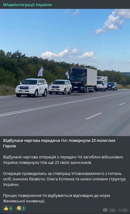 12.22 В рамках очередного обмена погибшими, Украина вернула тела 25 военных, сообщили в Минреинтеграции.
