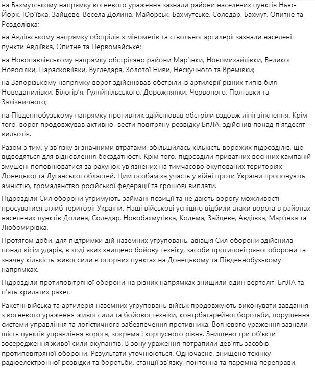 1. Отбиты попытки наступления российских войск в районах Соледара и Зайцево (Бахмутское направление), Шахты Бутовка и Спартака (Авдеевское направление).
