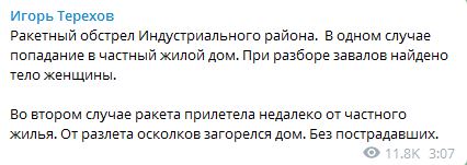 06.00 Ночью армия РФ ударила по Индустриальному району Харькова двумя ракетами. В одном случае ракета попала в частный жилой дом. От осколочного ранения погибла женщина.