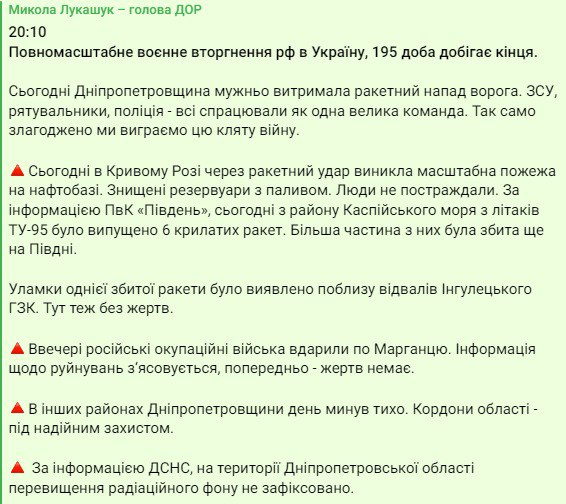 Об этом сообщил глава Днепропетровского облсовета Николай Лукашук в своем тг-канале.