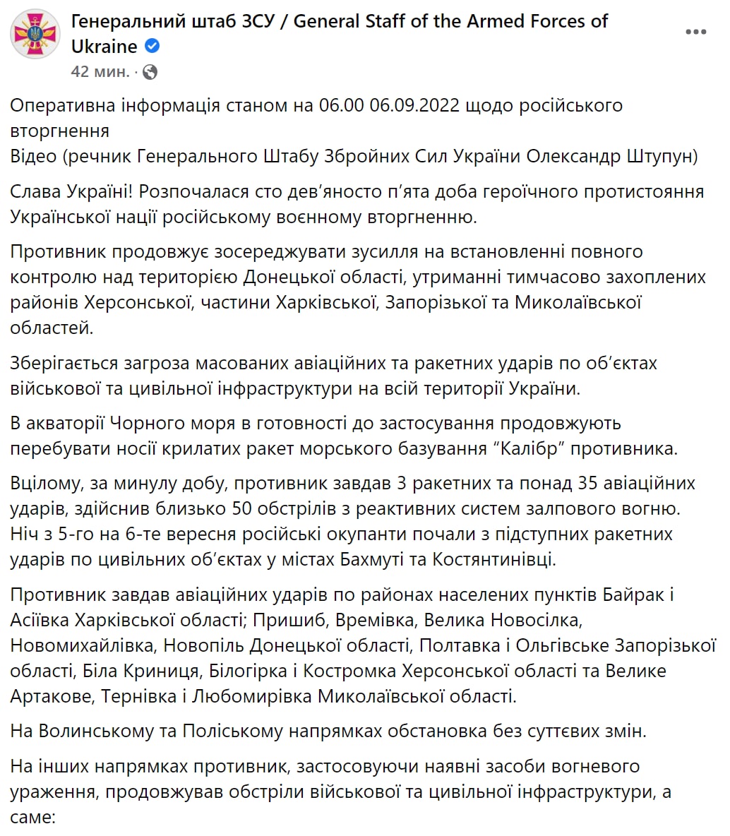 Генштаб ВСУ опубликовал сводку о ситуации на фронте на утро 6 сентября.