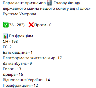 Народный депутат от партии "Голос" и член переговорной группы с РФ Рустем Умеров стал новым главой Фонда госимущества. За его кандидатуру проголосовали 282 народных депутата.