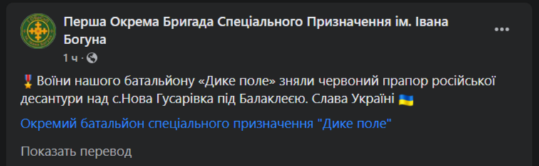 "Воины нашего батальона "Дикое поле" сняли красное знамя российской десантуры над селом Новая Гусаровка под Балаклеей", - сказано в сообщении бригады.