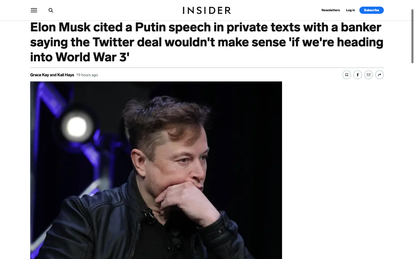 Однако накануне выступления Маск хотел "притормозить" свое приобретение Twitter за 44 миллиарда долларов, заявив в частных беседах, что покупать Twitter не имеет смысла, "если мы движемся к Третьей мировой войне".
