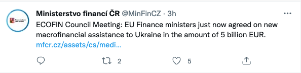 В заявлении говорится, что средства будут направлены на стабилизацию украинской экономики. Глава Минфина Чехии Збынек Станюра отметил, что средства пойдут на "повседневную деятельность государства и обеспечит работу критической инфраструктуры в стране, такой как офисы, школы или больницы".
