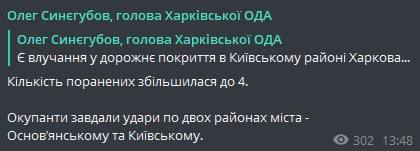 "Попадание в центр города, прилеты в Основянский и Киевский районы", - написал он.
