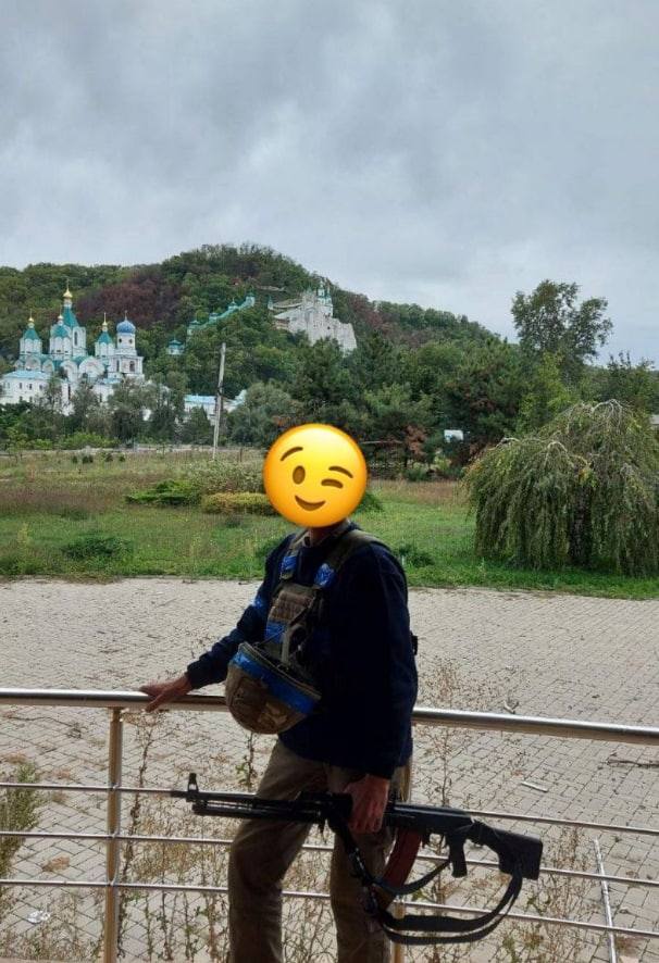 На первом снимке украинский военный позирует на фоне инсталляции в виде сердца с надписью на украинском языке: "Я город-герой Святогорск - место силы", на другой - стоит с автоматом на фоне Святогорской лавры, по которой ракетные удары наносились даже во время молебна.