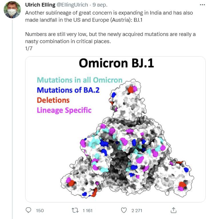 Новый вариант штамма коронавируса "Омикрон" под названием BJ.1 распространяется в Индии, прибыл в США и Европу (Австрия). Об этом написал ученый-исследователь мутаций Ульрих Эллинг у себя в Twitter.