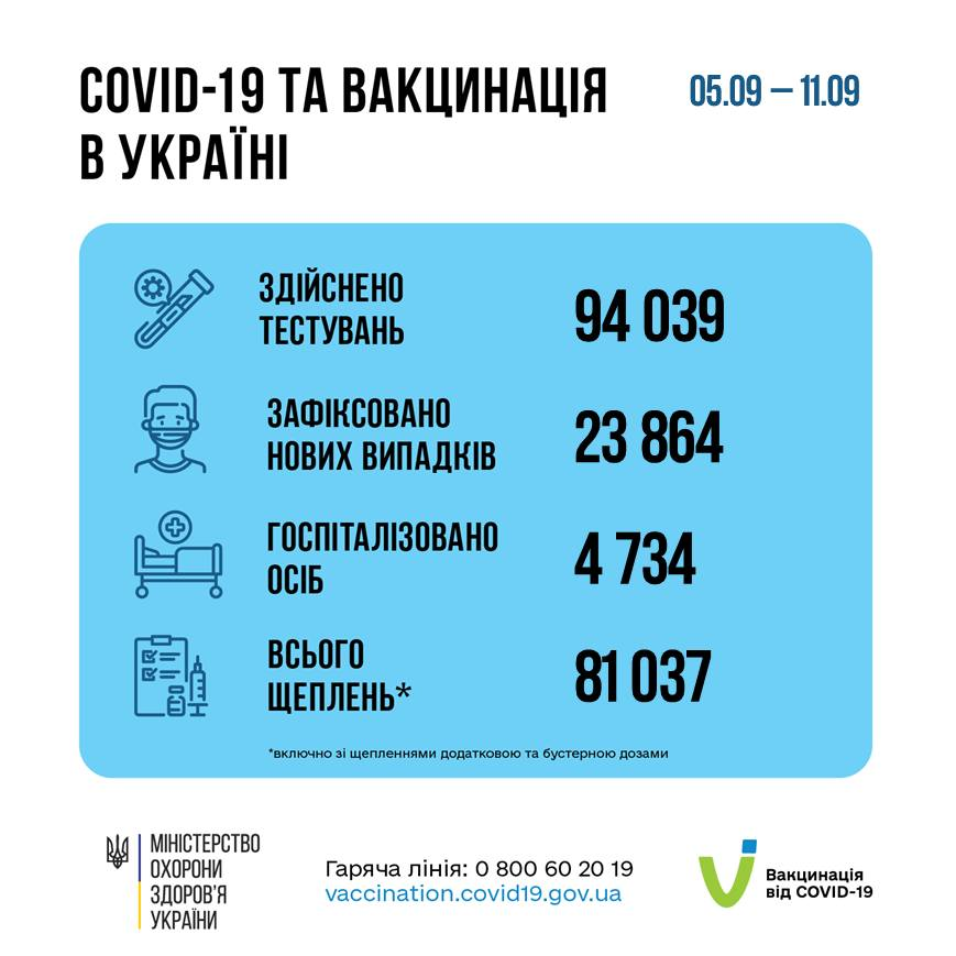 Ведомство сообщает, что в период период с 05.09 по 11.09 зафиксировано 23 864 новых подтвержденных случаев COVID-19 (из них детей – 3706, медработников – 551), а также 81 037 человек были вакцинированы против COVID-19.