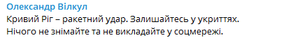 Сегодня, 14 сентября, Кривой Рог подвергся ракетному удару. Об этом сообщил руководитель военной администрации Кривого Рога Александр Вилкул в своем телеграм-канале.