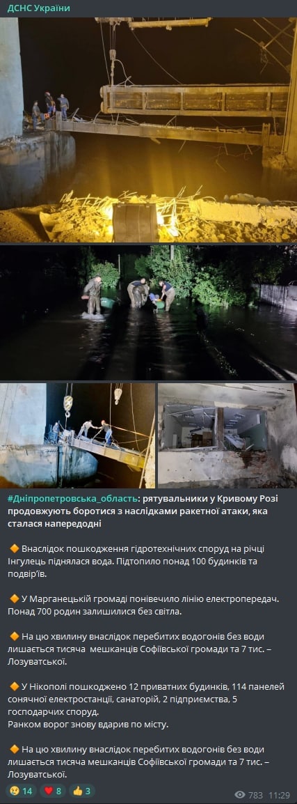 Последствия ракетного удара ликвидировали всю ночь. По словам главы Криворожской ВГА Александра Вилкула, по дамбе били ракетами "Кинжал" и "Искандер", подтоплено 112 домов в Ингулецком районе, оттуда эвакуировали людей.