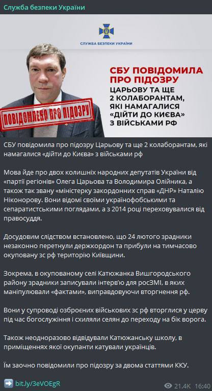 "В селе Катюжанка Вышгородского района предатели записывали интервью для РосСМИ, в которых манипулировали "фактами", оправдывая вторжение России. Они в сопровождении вооруженных военных сил РФ вторглись в церковь во время богослужения и склоняли крестьян к переходу на сторону врага. Также неоднократно посещали Катюжанскую школу, в помещениях которой оккупанты пытали украинцев. Им заочно сообщили о подозрении по двум статьям УКУ", - говорится в сообщении.