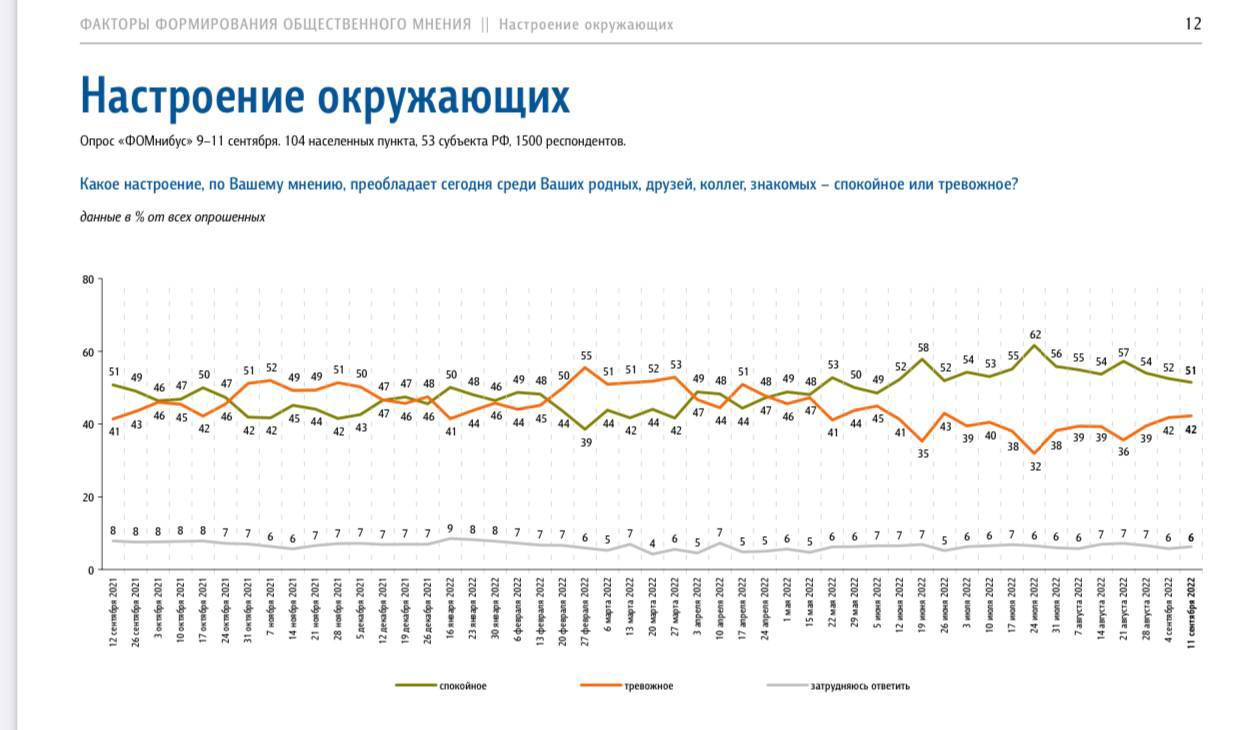 С тех пор динамика меняется, 11 сентября уже 42% заявляли о "тревожных" настроениях, тогда как процент "спокойных" снизился с 57% до 51%.