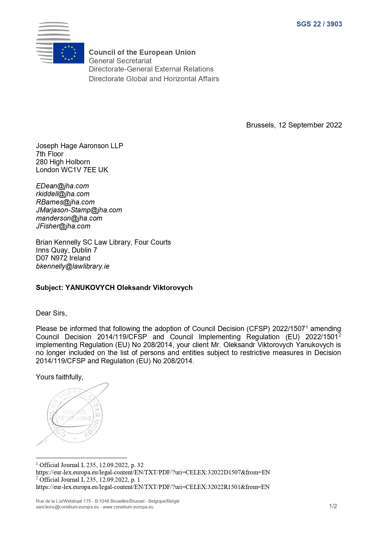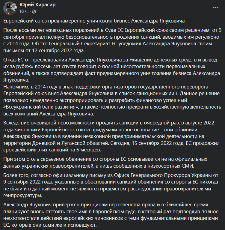 Кирасир сообщил, что после восьми лет ежегодных поражений в Суде ЕС Европейский союз своим решением от 9 сентября признал полную безосновательность продления санкций, вводимых им регулярно с 2014 года. Об это Генеральный Секретариат ЕС уведомил Александра Януковича своим письмом от 12 сентября 2022 года.