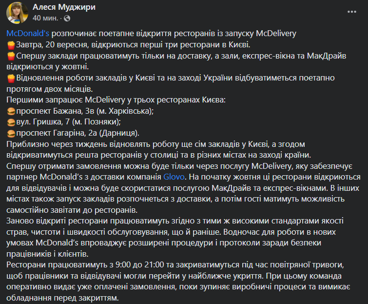 McDonald's заявил, что первые три ресторана в Киеве откроются с 20 сентября. Но работать они будут пока только на доставку.