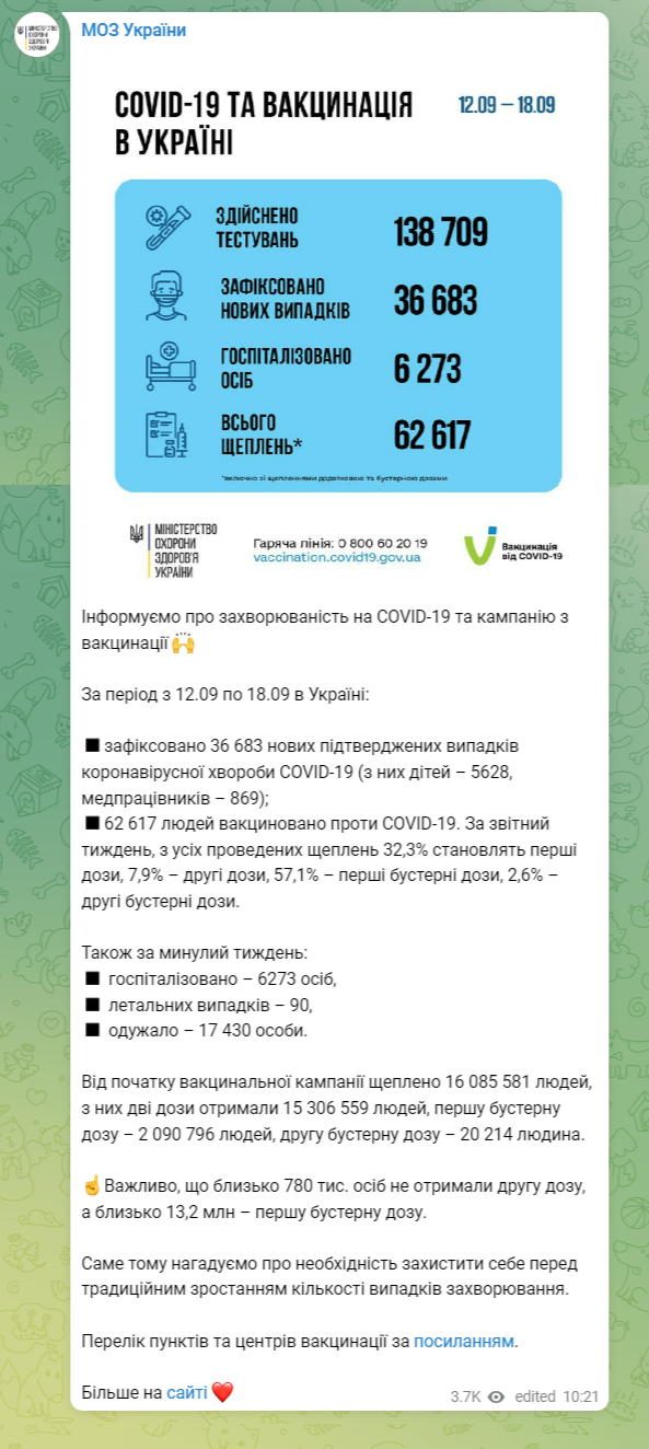 По данным Министерства здравоохранения, в период с 12 по 18 сентября в Украине зафиксировано 36 683 новых подтвержденных случаев коронавирусной болезни.